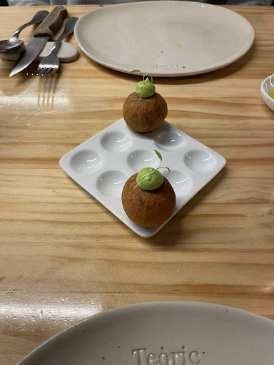 If I could give more than five stars, I would!Teòric offers an exquisite and intimate local dining experience that's truly memorable. They have two set menu options—10 or 13 dishes. We opted for the “smaller” 10-dish menu and still left feeling full and more than satisfied. The service was outstanding: attentive, knowledgeable, and warm. The team cultivated a relaxed, minimal, and welcoming atmosphere that made the evening feel extra special. Now for the highlight—the food and drinks. Teòric serves a delightful non-alcoholic malt beer, and my husband was particularly impressed by their selection of local natural wines. We also received complimentary filtered water. The food itself was impeccable: a refined, modern twist on traditional Catalan cuisine, with a strong focus on sourcing seasonal ingredients. Each dish delivered a surprising and beautifully balanced flavor profile. Together, the ten courses showcased a thoughtful and satisfying range of tastes and textures, accompanied by some delicious sourdough bread (we received two generous serves). As a small note, I would have loved a printed version of the menu—it was so beautifully created! Highly, highly recommend. Excellent value for money as well. This was easily one of our favourite dining experiences to date.