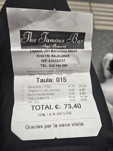 I DO NOT RECOMMEND, SCAM FOR TOURISTS! I don't usually write reviews, but I have to here because it's been a long time since I left a restaurant so disgusted. No drinks card and astronomical prices on the bill. A liter jug โโof sangria costs 23.5 euros, and it's the usual one from the supermarket with added fruit (apple and a few orange slices). When ordering any drink, you don't know how much you will pay for it. I have been to Spain many times, but I have never eaten worse Paela mixta. 4 shrimps and one shell, and the paela itself was the smallest I've ever ordered (it cost almost 33 euros for two people). The paela had chicken meat with cartilage that was inedible. Additionally, the prices in the menu are given without tax (10%), which is then added to the bill. I DO NOT RECOMMEND, STAY AWAY...