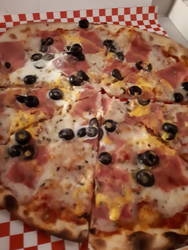 Casual restaurant serving a variety of pizzas, with a brick wall decorated with paella pans.