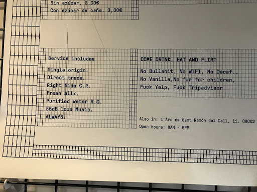 Read more€3 for an espresso and €5.20 for a little cup, oh sorry it is officially a 'macrobiotic bowl' of chia pudding that I failed to finish due to the snorty consistency and noticeable absence of flavors. The espresso is ok, but not €3 ok. The first one the barrista left to sit on the machine and by the time she got it to me no crema left, although I was standing right at the bar, so of course I requested a redo. Second one ok. A little acidic but fresh beans. Young and rebellous attitude as you can see from the sign but you'd better be rich enough to toss €20 at a coffee shop without getting anything good...