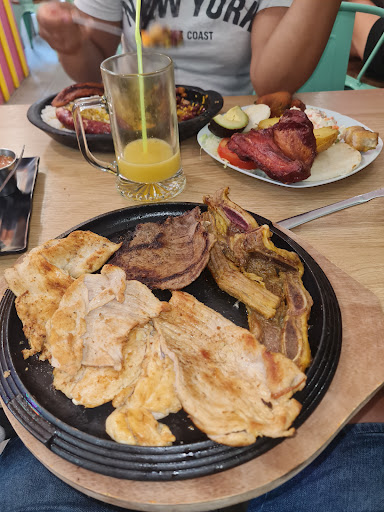 dos pedazos de papá Ensalada Arepa Una costilla de esas del mercadona solo fritas que por cierto esta en el otro plato parecía una piedra, seca y sin sabor. Un pedazo de churrasco todo duro y feo también sin sazón. Un pedazo de carne seco y medio quemado, fino casi me mata al comérmelo de lo seco que estaba. Creo que por ahí unas 5 piezas de Pechuga que parecían hervidas desabridas y más seca. Intente comerlas con salsa pero aún así me ahogaba 1 Lomo seco también 1 chorizo la mejor de la parrillada