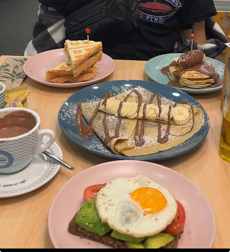 Read moreStopped here after fisio with my husband and were we glad we did! First, great signage, beautiful, cheerful well-lit decor, and just so sunny! A wide selection of egg dishes including combo platas of eggs, french toast and bacon that I had that was some of best french toast I ever had. Bacon and eggs cooked perfectly. My husband had a plata with pancakes that were light and fluffy plus the perfect size for eggs and bacon platter. Yummy coffee too. The service was exceptional for this busy cafe but they never rushed you. They also serve some scrumptious looking ice cream and fruit sorbets we will try next time. Bathrooms clean and well stocked always a plus for me! Go to Waffle— you won’t regret it! We ate before we thought to take pix so I put menu pictures up. ...