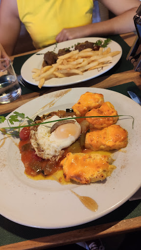 Nota alta para este establecimiento. Un personal muy atento tanto en barra como en mesa, si bien cabe destacar la simpatía de Nuria que estuvo encantadora. Entramos con intención de tomar el menú de fin de semana porque parecía estar muy bien por 23,00 euros, pero cuando vimos la carta de raciones, picoteo, hamburguesas, etc., nos decidimos por ésta. Sacamos unos Nachos con varias salsas para picar, unos huevos con el nombre del local y una ensalada César. Los primeros estuvieron genial, pero la presentación del plato de los huevos estaba de diez. Un nido de patatas fritas de ‘las de verdad’, caseras auténticas, cubiertas por unas finas lonchas de jamón sobre las que descansaban dos huevos fritos con puntillita y yema sin cuajar. Y todo ello acompañado también de unas jijas. ¡Chapeau!. Hasta el pan estaba excelente. La ensalada era grande y estaba buena, aunque por ponerle un pero, -así lo advertimos- es que llega a la mesa cubierta completamente por la salsa mayonesa y no a todo el mundo le gusta. Es mejor napar un poco para su presentación y se acompañe con una salsera para quien desee poner más al gusto. En resumen, una fantástica experiencia y un nuevo lugar de referencia en Ajo. De agradecer también el detalle de no cobrar una infusión que tomamos. Repetiremos. Muchas gracias y felicidades...