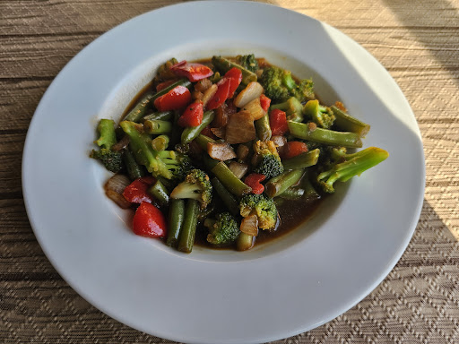 Pilgrim menu is a 3 course meal including a drink for 14 euro but there's not even a vegetarian option. So I had to choose from the normal menu and ended up with the vegetable wok. I expected it to have some rice or pasta to be a good filling meal, especially for a pilgrim. But no, it was 3 vegetables in some salty soy sauce. Total price, 12,50 for some vegetables and a drink. Compared to the pilgrim menu I paid way too much. I was still hungry afterwards.