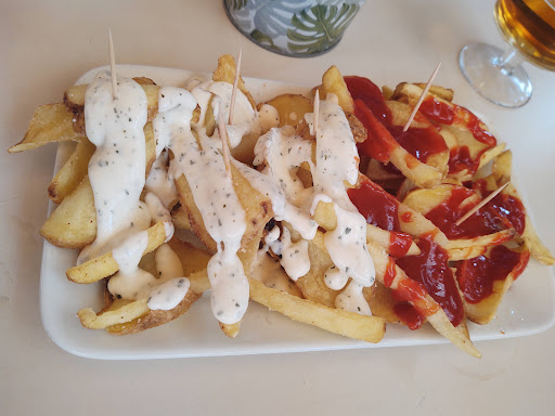 Tenía anunciado en un cartel en la puerta que disponían de raciones, bocadillos, platos combinados... Y vimos que había una mesa libre en la terraza y decidimos parar a comer. Después de un rato en la terraza llegamos a la conclusión que no la atendían, entramos a ver qué nos ofrecían de comer y resultó que de todo lo anunciado fuera solo nos podía ofrecer una ración mixta de patatas alioli y bravas, que además la salsa brava resultó ser kétchup con un pelín de picante. Decepcionante la salsa. Nos dijo que no podemos comer porque no teníamos mesa reservada, le indicamos que estábamos en una en la terraza pero eso no le valió y solo pudo ser esa razón. El precio normal, dos cañas, dos sin y las...