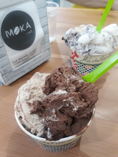 Aunque tenía mesas fuera, ahora en verano el calor no perdona. Dentro pedimos unos helados bien generosos y con unos sabores conseguidos. Tienen también un bidón de agua bien fresquita para autoservicio y los camareros son amables.