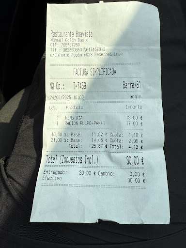 Hemos comido un menú de 13€ y un pulpo a feira de 13€ más una botella de tercio de agua de 1€ según los precios publicados en un cartel de un rincón del restaurante porque no te dan la carta escrita. Al pagar me ha dicho 30€. Extrañada he preguntado que sólo he tomado pulpo. Me ha dicho el camarero que era lo mismo. La foto de los precios la hice después. En lugar de pagar 27 como máximo he pagado 30€. Esto se llama TIMO. Lo que se paga no se corresponde con precios publicados. Ya está bien de intentar engañar