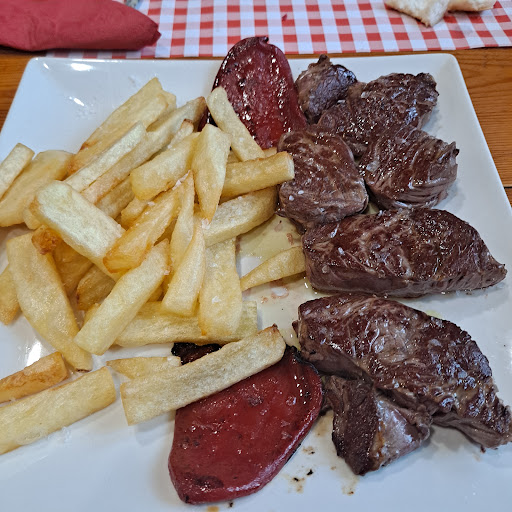 De segundo, dos de ternera a la brasa en su punto. ESPECTACULAR. Acompañada de pimiento del piquillo y unas patatas fritas inolvidables.