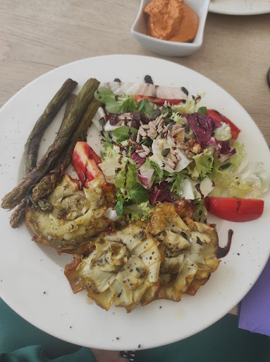 Llegamos aquí huyendo de otro restaurante del pueblo donde parecíamos molestar por ser veganas. Y menos mal. El camarero nos ofreció un plato combinado con ensalada, espárragos y corazones de alcachofa, además de patatas con pimientos. Estaba todo muy rico y hemos salido muy contentas de allí. Es genial que nos haya escuchado y ofrecido alternativas. (Y además, ha puesto muy...