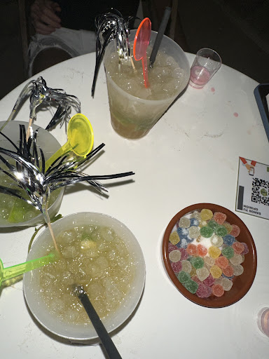Carta cocteleria realizada por vanesa campeona de españa este año....si gastamos oxifruit 89% fruta natural y todas las licencias de sanidad. Los mix deben fecharse y revisarse por sanidad porque pueden causar intoxicaciones... Los licores para los cocteles son primeras marcas...barcelo...mojito....y gastamos concentrado de azucar de caña natural....los mix se deben congelar al vacio no como muchos que trabajan con fruta sin fechar i pueden causar problemas. Nuestras copas tienen medidas perfec service es decir la medida perfecta de alcol... Todo se sirve en la barra delante del bar y no escondemos nuestras botellas ni medidores. Con cads gym puedes elegir tu tonica premium preferida gratis. Y lo mejor de todo es k tanto en el local como en la playa son los mismos precios. En la playa nos obligan a utilizar plastico reciclable para las copas. La rapidez del servicio tambien depende del tipo de pedidos que hayan delante ya k en la carta esta explicado que el tiempo de espera medio es de 15 minutos. El local se ha diseñado para disfrutar,desconectar y relajarse...no para ir de fiesta o emborracharse. Las hamacas de playa y sombrillas son totalmente gratis por ser cliente del xiringuito...y los precios son similares a cualquier local de alrededor estando escuchando...oliendo y casi...