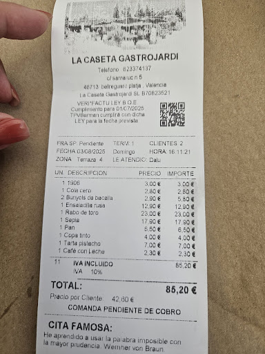 Read moreA delightful place with delicious food and good service. We took potluck and arrived early without a reservation. Luckily we secured a table in the sun and out of the wind so could enjoy the al fresco experience. Our waiter was prompt and courteous, even speaking some English for our benefit. The menu is varied with a healthy selection of rice based dishes as you would expect in this region. We had a salad and bread to start, both of which were delicious, the salsa with the bread was exceptional and the salad fresh and delicately flavoured, followed by the sepia tempura which was shared between 2 and a hamburger. Both were declared excellent and somewhat unique. We shared an apple tartin and the chocolate tart, and again, both were superb, all washed down with the house white wine from the Valencian region, which was perfect for lunch. A super spot for a truly superb lunch, we...