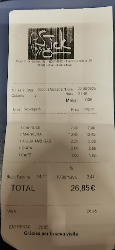 Read moreHi poso 1 estrella perquè no hi ha 0 estrelles. Mai ens ha passat res igual ni a Puigcerdà ni ha Escadarcs ( les altres Pizza Stick), i fa molts anys que hi anem. Ahir al vespre, a les 20,30 el local era buit a exepció de 2 taules. Tot desert... Un noi i una noia a l'entrada, lis diem que volem sopar allà i ens diu que no pot ser, Devant la nostra sorpresa ( erem 2 persones) li diem amb sorna... que ho tens tot reservat?, es riu descaradament i ens diu que si, amb tota la cara del mon, es veu de lluny que no te ganes de treballar. Marxem al bar de devant a sopar, per cert bonisssim i super recomanable (La Tasca de Bellver). Veiem que no entra ningú i quan marxem a les 9,45 segueix el local buit. Potser aneu molt sobrats de feina, però això sempre es torna en contra si no cuides la clientela. Una pura vergonya, ja he vist altres ressenyes que els hi ha passat el mateix. Nosaltres no hi...