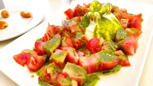 La sorpresa más agradable fue la comida. Comenzamos con una ensalada de tomate con burrata y pesto que nos dejó gratamente sorprendidos. Cada bocado era una explosión de sabores frescos y deliciosos. La combinación de los tomates maduros, la cremosidad de la burrata y el toque aromático del pesto crearon un plato fabuloso que nos conquistó por completo.