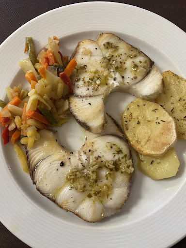 Probé un risotto negro con calamares y alioli más que correcto para un menú del día. Arroz en su punto, sin abusos de nata y con un sabor natural y bien equilibrado. De segundo escogí cazón a la plancha que acompañaron de unas verduritas y de patatas panaderas. Muy bueno. Para acabar una buena cuajada (de las que tienen sabor) con miel.