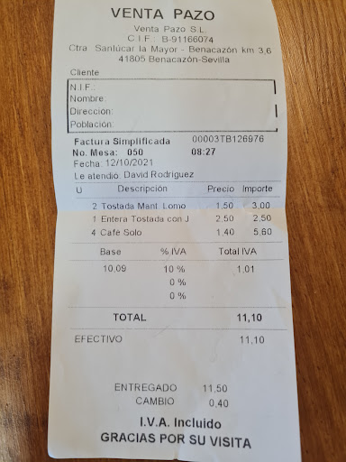 Read moreEl pasado sábado entramos, a desayunar, camino a la playa de Mazagón, en esta restaurante, Venta Pazo, en Benacazón, Sevilla, junto a la autovía A-49. Al pagar el rico y delicioso desayuno que tomamos, se nos olvidó, sobre la mesa, un pequeño monedero, con el que pagamos la cuenta. En él habían unos 70€. Al llegar a Mazagón, lo echamos en falta y por supuesto que lo dimos por perdido. No obstante el domingo al regresar de Mazagón hacia la provincia de Badajoz, nuestro lugar de residencia, y dado que teníamos que pasar por esta Venta Pazo, decidimos llamar. Y cual fue nuestra sorpresa que el empleado "Velázquez" nos dijo que allí estaba nuestro pequeño monedero. Cuando entramos en este restaurante, preguntamos por Velázquez y nos recibió muy amablemente a pesar de que estaban en plena hora de servicio de comidas. Y por sorpresa de todos nosotros allí estaba nuestro pequeño monedero, con nuestros 70€. Esto, hoy en día, por desgracia no es lo habitual. Por tanto queremos destacar la amabilidad, empatía, honradez, humanidad y profesionalidad de todo el equipo de esta Venta Pazo y en particular del empleado Velázquez. Les enviamos un fuerte abrazo a todos ellos. Muchísimas gracias por vuestra inestimable ayuda y generosidad. Ojalá hubiese más personas como vosotros, sin lugar a dudas, este mundo sería muchísimo...