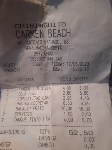 Read moreTerrible. We were left waiting for at least an hour cost €30 on 4 drinks before we got our food cause it took about a hour for it to come out and food was HORRIFIC. 2 of us got food poisoning and the other got sick and we had to bring them to hospital thank god for you’s our flight was the next day so we couldn’t come back but trust me WORST RESTAURANT IN BENALMÁDENA by far. There is a restaurant down the road next door to McDonald’s names horizon 10000% the best food place I’ve gotten here far we go there every night every year for the past 7 years. But CARMEN is actually DISGUSTING DO NOT...
