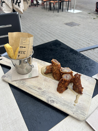 Iberian pork flamenquín with ham, goat cheese, mushrooms, and fries €17.20