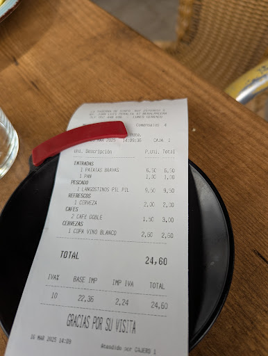 We had a light lunch here enjoying the Garlic Pil Pil Shrimp...very tasty. The Patatas Bravas were nice and could be elevated a little with a more unique sauce. The potatoes were crispy and creamy at the same time. The spicy mayo was tasty but could be elevated a bit with cebola and perhaps a crema element. Still satisfying. Service was friendly and prompt and patient with our limited Spanish capabilities. This makes a huge difference to us and this place made us feel welcome. We had coffee, wine and cerveza as well. If you are bothered by smoke the patio might not be your thing. Overall we enjoyed and...