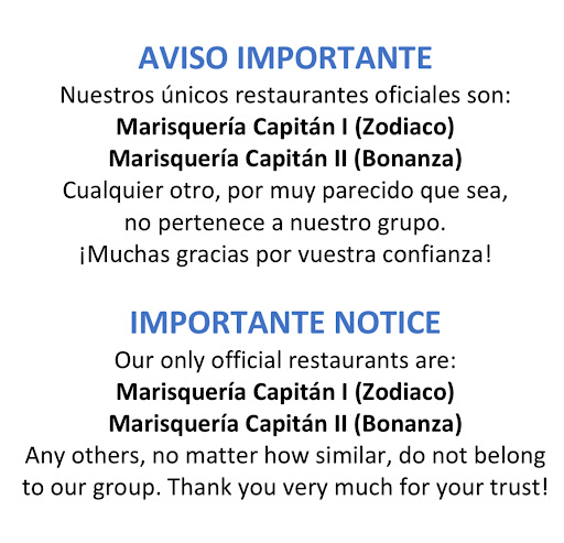 📢 Como parte del equipo de Marisquería Capitán, siento la necesidad de escribir esta reseña no para puntuar nuestro propio negocio, sino para aclarar una información importante que muchos clientes deben conocer. Nuestros únicos restaurantes oficiales están en: Capitán I (Zodiaco) y Capitán II (Bonanza). Cualquier otro local, aunque tenga un nombre o aspecto parecido, no pertenece a nuestro grupo. Agradecemos de corazón la confianza y fidelidad de tantos clientes a lo largo de los años. ¡Muchas gracias por seguir eligiendo la auténtica Marisquería Capitán!