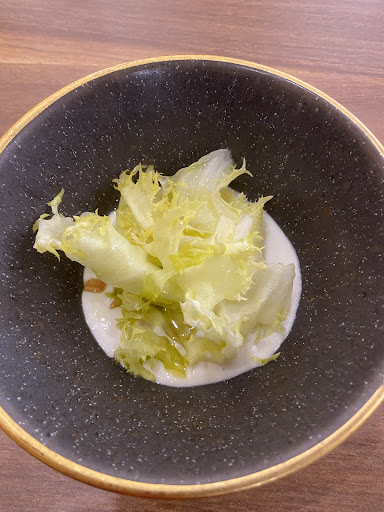 El local, con mucha elegancia. Mesas amplias, cubertería exquisita, recambio de servicio con cada plato, aceites de Jaén (variedad picual muy sabrosas), pan de masa madre hecho en casa… genial.