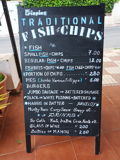 Better for take away than dine-in. Because Crispies isn't near our apartment we ate in but that definitely spoilt our experience. The table tops were clean but every chair was dirty with big black marks. We sat outside the smell of cooking was too much inside. We were the only ones dining in. The large haddock was perfect, golden & well cooked, no grease at all. The chips were OK. Ordered bread & butter, one slice with non- butter spread for 80c. A couple of spoonfuls of mushy peas 2.50€ . Nice mug of tea. The fish was comparable to one's we enjoyed at Oceans. Everything else, the chips, the portion size, the bread & butter, the views & atmosphere & especially the cleanliness thenOceans is the best...