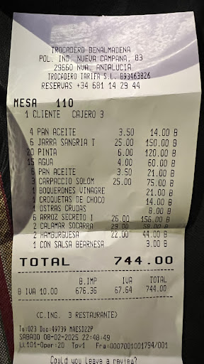 Read moreGiving 5-stars is nothing I do easily. If it's a three star Michelin restaurant or an establishment selling sausages on the corner, the overall experience is what counts. Perhaps one of the things are better than normal or exceptional which will push the experience to perfection and by that reign full points in total. In this case there where no question about it because everything was great. This restaurant had an impressive ambiance and service already when we arrived. We booked a table just the day before and it was located next to the outside porch directly under the roof with an exceptional view of Benalmádena beach. I feel that I have to talk a bit about the restaurant first. When we got our table I had to have a walk around the restaurant which is really big and made entirely out of dark wood. It has at least three big bars and a couple of smaller ones as well as seating both inside and outside. There are several floors and all tables are in a weird way incapsulated in the total ambience of the restaurant. The furniture and design is very very nice and everything looks like it was staged for a travel video. Very impressive I must say. The staff was very attentive and the sommelier helped us out with the local wines even though we had our own sommelier with us. We decided on some sushi, with their Trocadero touch, for everyone as a starter and they where great. We actually discussed if we should take one more serving, but decided to wait for the mains. For main course two of us had the "Catch of the day" which was Red Snapper. I had Sirloin and one of us had the Sole. Kids had homemade burger and homemade chicken nuggets. All of the food was great as well as the service. To drink with this we had Sangria, a Temranillo from Ribera de Duero which they had on glass, a sweet local Moscatel and beer. All of it was of course great as well. I will as usual include the reciept and photos of the menu so you can check the prices. All in all a great restaurant and a place i recommend everyone in the area to try. It must be one of the best restaurants around here. I don't know how to top this when you add the ambience and location to the equation. A must visit for everyone at...