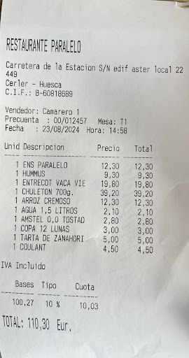 Read moreAquest estiu hem tingut l’encert de dinar al Paralelo, que és aquest restaurant a Cerler. Hem dinat còmodament a la terrassa coberta amb el nostre gos i hem gaudit d’un molt bon menjar i d’un molt bon tracte. Les carns, molt bones i molt ben cuinades. Un entrecot i un “chuletón” boníssims (segons asseguren els carnívors de la família) acompanyats de patates i pebrot verd. Un arròs de bolets i parmesà també molt bo i una amanida molt complerta. Les postres també molt bé i el tracte per part dels empleats, immillorable. Resumint, que si voleu dinar en un restaurant ben situat, molt agradable i amb caliu (sense ser d’aquells de “tocat i posat”) i gaudir sobretot de bones carns (tot i que veia gent d’una altra taula demanant també un rap que feia molt bona pinta), l’encertareu si aneu al Paralelo, a Cerler. D’altra banda haig de dir també que el preu és més que correcte, acostumat com estic als preus...