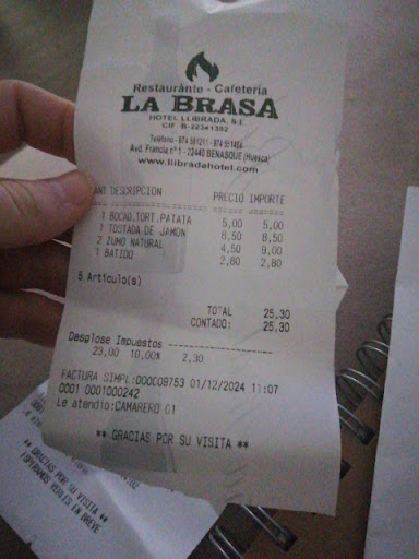 Read moreLlegamos a las 5.20h de la tarde justo después de hacer montaña y decidimos entrar porque vimos un cartel grande a fuera que ponía "servicio todo el día, platos combinados, caldo, carnes a la brasa, ensaladas..." y además habíamos estado hace años y no tuvimos problema alguno. Además y cómo detalle, en los salvamanteles ponía la frase "no mire la hora, entre y coma" (ver foto). Entramos y el camarero nos dice que sólo sirven carne a la brasa y ensalada mixta "porque a esa horica..."(palabras textuales suyas)...nos quedamos un poco pensativos y decidimos quedarnos y pedir longaniza a la brasa (10€, un poco caro teniendo en cuenta el plato -ver foto). Había sólo una mesa más a parte de nosotros y tardaron más de 20 minutos en servirnos. Calidad de la carne mejorable. Es una pena ya que el local es bonito y acogedor....
