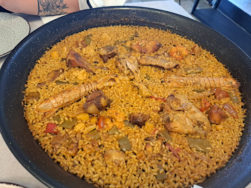 La ensalada se presentó con ingredientes frescos y en su punto justo de aliño, ideal como entrante. Los calamares, por su parte, llegaron en una fritura ligera, crujientes por fuera y tiernos por dentro, demostrando una ejecución precisa. Sin embargo, el verdadero protagonista del menú fue la paella mixta: un arroz perfectamente cocinado, con un equilibrio de sabores notable entre carnes y mariscos, y un fondo sabroso que evidencia el cuidado en su elaboración. Sin duda, una paella espectacular.