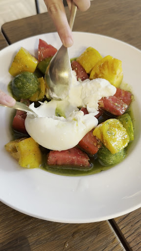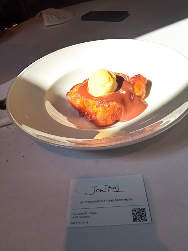 Empezamos con una cerveza y un plato de cecina de buey por recomendación de la camarera. A mi no me suele gustar el sabor de la cecina pero este plato fue una grata sorpresa. Un sabor exquisito la verdad. Continuamos con un ceviche de salmón super fresco donde resaltaba el producto principal muy bien acompañado por la leche de coco y los pepinillos encurtidos. Después pedimos la ensalada de tomate con burrata. La burrata muy buena, pero los tomates sin palabras. Un sabor realmente increíble. Tuve que preguntar a la camarera de donde eran y todo (de Cabanes). Chuletón de buey como plato principal. Sinceramente nos encantó. Mi pareja estaba alucinando con el chuletón ya que en Holanda no hay productos como aquí. Un sabor exquisito, muy jugoso y tierno. Como dato interesante, preguntad sobre la historia de los bueyes ya que solo sirven producto de su propia ganadería en Vilafranca. Para terminar pedimos la torrija de brioche con helado. Una de las mejores torrijas que he probado. El brioche le da mucha jugosidad y esponjosidad y el chocolate por encima con el helado lo acompaña perfectamente.