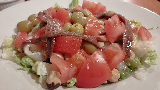 En el nostre cas, vam escollir una amanida Raki amb canonges, pollastre arrebossat, formatge curat, tomàquet, ou i vinagreta d'ametlles de mòdena. I una amanida de Bacallà amb bacallà, enciam, anxoves, olives, tomàquet, ametlles i avellanes. Les dues propostes eren ben elaborades i condimentades. Generoses i gustoses. Fetes al moment i amb una combinació adequada dels ingredients. Totes dues recomanables. Tot i que, la Raki és un 10.
