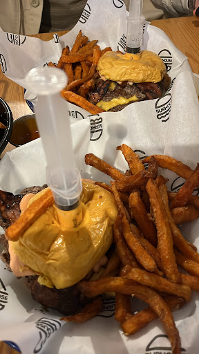 Read moreFlojo, 14 € una hamburguesa de doble 120gr, que dudo que pesase 240gr. la hamburguesa entera...bueno pase... Es complicado de calcular a ojo. Lo peor el tener que comer la hamburguesa como si fuera un plato combinado, el pan demasiado pequeño para sostener las dos hamburguesas, además la jeringuilla que colocan en la que pedí, que tiene mismo nombre que el sitio, por lo que pensaba sería exquisita, luce original, pero es un desastre. Deja un agujero enorme en su interior y la combinación de pan pequeño de hamburguesa con agujero grande en medio que la deja como un donut, acaba en destrozó en el plato. Es imposible que mantenga un mínimo de consistencia con ese pan. Al final no pude ni degustarla si no que tuve que pedir un tenedor para comer todo lo que se había desecho. Al final un desastre pagar 14€ por lo que acabó siendo un plato combinado pues no es de agrado, sobre todo si eres fan de comer hamburguesas. Recomendación, descartar para esa burguer esa imitación de pan y pillar de Juanito Baker o similar. Le falta camino para poder cobrar 14€ por una hamburguesa. De momento esa no los merece ni de lejos. Además como dato final, para ser hamburguesa de 120gr ni siquiera pidieron el punto de la carne, algo que ya de primeras me sorprendió, por eso pongo en duda su peso. Y se...