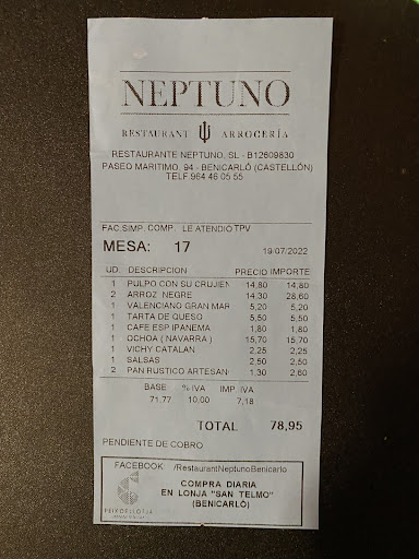 Read moreFantástica experiencia culinaria. Servicio de 10. Sólo al entrar ya te das cuenta del nivel del restaurante. Mesas bien preparadas, limpieza, orden, decoración con gusto... Empezamos con unos entrantes. Navajas a la parrilla que estaban excelentes. Un pulpo con un crujiente espectacular, nunca había probado un crujiente de arroz, como una especie de corteza, buenísimo y el pulpo muy bien guisado, tierno. Y unas anchoas del Cantábrico con pimiento y berenjena. Los principales 2 arroces, de los varios tipos que tienen. Elegimos una paella de arroz con verdura y bacalao, sabrosisimo, con el arroz en su punto de cocción y un bacalao muy gustoso y meloso. Un 10. Otra paella con ortigas de mar y langostinos. Las ortigas buenísimas y el arroz también en su punto, sabroso, sabroso. Otro 10. El trato super amable, atentos, correctisimos, muy profesionales. Y los postres, verdaderas obras de arte, 10 en presentación y 10 en sabor. Lo recomiendo, quien pase por Benicarló tiene que probarlo. Muchas gracias a todo el personal por su atención y amabilidad y muchas gracias al Chef y al personal de cocina por deleitar nuestros paladares con unos platos tan bien...