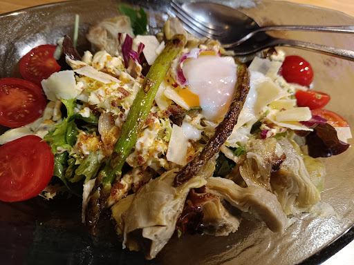 Read moreLocal agradable. Mala atención inicial que fue mejorando durante la cena. Ni un aperitivo cuando pides la bebida y esperas que te traigan lo pedido. Pides una hamburguesa para un niño, indicando que lno le pongan hoja de roble y te dicen que no pueden, ?es que las tienen hechas ya y las re calientan? No es comprensible. Salsa curry de bote. Ensaladas correctas. Gangas Rojas muy buenas al igual que las alcachofas con sepia. Patatas bravas también ricas. Postres pequeños pero exquisitos y a un precio razonable. Vinos carísimos. Con poco que mejoren detalles, la experiencia...