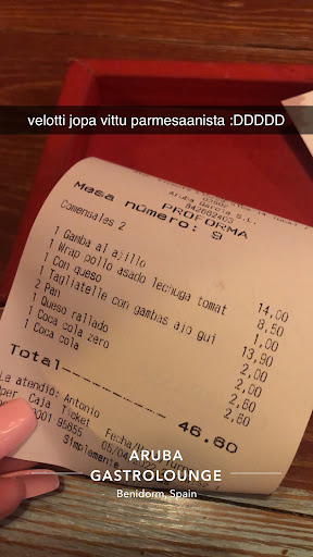 Read moreToday my friends and I went to Aruba restaurant. When we arrived the place was half full and we were taken to a table in the back. One of the waitresses took our drink order. We ordered one moscow mule and 3 Aperol spritz. The moscow mule was good but the Aperol was mediocre. And after a long while, a different waitress came and took our food order. We ordered the nachos and 3 portions of shrimp tagliatelle and one portion of duck and truffle tagliatelle. The appetizer came after approximately 20 minutes and it was good. We waited for the mains over an hour and at some point we asked the first waitress about it. We saw the two waitresses talking to each other and it was clear that they forgot about our order. The food came and the duck and tagliatelle pasta was a 7 out of 10 and the shrimp tagliatelle was not prepared correctly. The pasta did not have any flavor, no salt no garlic no nothing. We tried to call someone to our table to fix the problem but everyone was busy so I went to the bar and asked to have it replaced. When the pasta came back it had a puddle of sauce and too much garlic. It was horrible. We had to ask for the check two times to receive it. I do not recommend the restaurant. The waitress were impolite and the experience was a 0 out of 10....