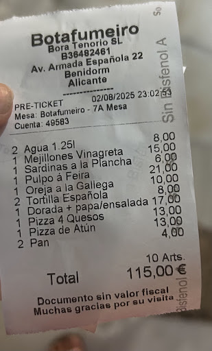 Read morePlease don’t trust all the positive reviews here, many of them seem to be paid! We were a group of 8 and ordered 10 different dishes, but none of them were edible. The kids’ pizzas were frozen and undercooked, while the sea food was simply disgusting. The seafood lacked any flavor, and the shrimp dish only had about 10 tiny shrimp drowning in a liter of oil! I’ve eaten at many places in Benidorm and all over Spain, including Valencia, and I've never had such a terrible experience with food or service. This is definitely not representative of true Spanish cuisine...