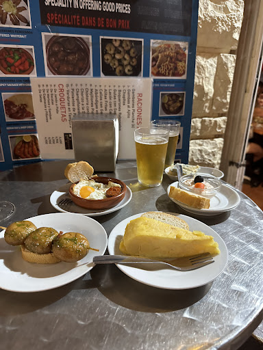 Nobody in when we got there, female staff member rude shouting at us in Spanish, we ordered a drink and she slammed the glasses on the counter pored them and shouted for us to collect! We ordered our food, free mushrooms were the best thing, house red wine was nice, meatballs were factory made perfect balls, served with peas and carrots in what reminded me of soup, not nice, over cooked prawns just swimming in oil, croquettes gloopy, bread couple of days old and we didn’t get served our patatas bravas- mentioned it when we got the bill and she came and counted the plates on our table as she didn’t believe us. Another table asked her to turn the music down (it was quite loud) she said no 🤣🤣 she was ramming chairs and banging food down on tables it was obvious the customers were an inconvenience....