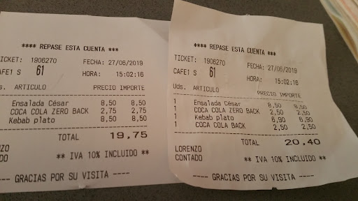 Read moreUn sitio nada recomendable ni por calidad, ni por servicio, ni por amabilidad, ni por atención al cliente, ni por nada. Dentro de que es un lugar cutre de por sí. La encargada o dueña o heredera no tiee ni idea de lo que es atención al cliente. Situación: pedimos una ensalada 8,50€ y cocacola (el precio no aparece en la carta) y un menú kebab plato, que incluye la bebida 8,50€ (esto no sólo se lo especificamos al camarero, sino que además se lo señalamos en la carta). Nos traen las bebidas y, sobretodo una de ellas, es todo hielo y prácticamente nada de refresco, por lo que se lo hacemos ver al camarero para que lo arregle. Ya, sin entrar en la calidad de la comida, llega la hora de pagar y nos ponen el plato kebab con la bebida aparte: Ensalada 8'50 Cocacola 2'50 Plato 6'50 Cocacola 2'50 Nos acercamos a la barra para que lo corrijan puesto que no es lo que ponía en la carta y la señora de la barra toda altiva nos dice que la bebida no está incluida que donde habíamos visto eso. Le enseñamos su carta y nos contesta:"ah! Pues os lo cambio pero también os corrijo el precio de la cocacola que os quite hielo y tuve que rellenar." Y así lo hizo. Nuevo ticket: Ensalada 8'50 Cocacola 2'75 Menú plato 8'50 Nos pareció una tomadura de pelo. Pedimos la hoja de precios y nos remite a una hoja pegada en la pared a tal altura y en cierto ángulo que no se ve nada. Además de que esta medio borrado y sin el sello oportuno. En ninguna de las cartas, publicidad del establecimiento está puesto el precio de las bebidas. Le preguntamos a 3 camareros y no sabían el precio. Pero a otra mesa cercana los refrescos se los estaban cobrando a 2'20€. Terminamos llamando a la policía y poniendo la...
