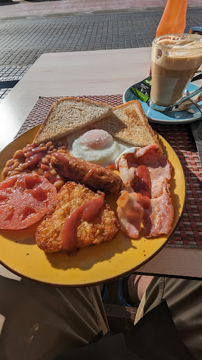 A Spanish run place in a great sunny location overlooking Poniente beach and still my fave Brit breakfast in old town Benidorm and I've tried a few. Probably had 20+ small breakfast over the last 2 years. Always consistent top quality. Egg, sausage, bacon, real tomato, beans, hash brown and toast and a coffee or tea all for €5. Enough to do me until evening. I once tried the Spanish traditional breakfast of tostada and smashed tomatoes with olive oil salt n pepper which made a nice change but I still prefer the small breakfast though. Never done the large breakfast as the small is plenty for me. Real heinz ketchup and HP sauce a bonus. Very good...