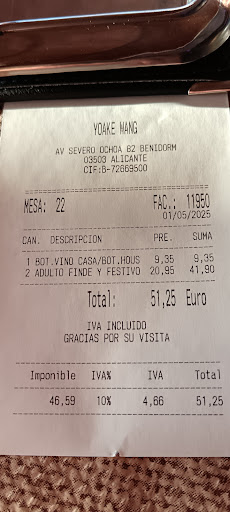 Read moreWe're here in Vila Joiosa and met with family for a few day's so last night we visited the new Japanese /Chinese restaurant at the top of the Rincón Jo Ake Wang it's all you can eat but not buffet style you order a few dishes, they cook / prepare them and serve you then you order more and so on and at 17.95€ very reasonable even the wine at 9€ a bottle for the house Red 11.95€ for a bottle of Emperado very reasonable So you take your order pad put how many portions of each you want an the waiter takes it of course if you order and not touch a plate they'll charge you extra but that's to cut waste The four of us enjoyed a really good meal with one exception the Szechuan Chicken is hotter than a Vindaloo which meant for me I couldn't eat it and the BIL who can eat spicy food had only one piece and refused more. This was the only off thing and we put this down to...
