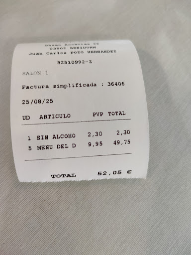 Read moreLa peor comida que he probado en muchos años veraneando en Benidorm. Pedimos hamburguesas, de las cuales todas vinieron cambiadas de ingredientes según expresa la carta del bar. Una de ellas tuvimos que pedir que nos la retirasen y cambiaran puesto que llevaba ingredientes que no pedimos y los cuales no podíamos comer por alergias. Al volver a servírnosla por segunda vez nos dimos cuenta que no la cocinaron de nuevo desde cero, sino que la limpiaron y la montaron con los mismos ingredientes que la primera vez y eliminando los que no queríamos. Nos dimos cuenta porque no venía tan bien montada como la primera vez, con sus lonchas de queso y huevo frito bien colocados, sino todo doblado y troceado, al igual que restos de la salsa que no podíamos comer por el pan y la carne. También se olvidaron de colocar el huevo frito esta vez. También pedimos sepia a la plancha que parecía un plato de sopa con trozos de sepia, no se sabe muy bien si a la plancha o guisada. Y algo caro los precios para la...