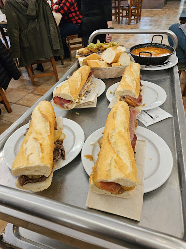 Emocionado por la experiencia que me ha hecho recordar mi juventud y especialmente mi servicio militar. La misma cola de 30 minutos para entrar en el comedor, las formas y el trato de la encargada del local que me recordó al sargento, aunque este último era más amable, el ambiente bullicioso, en fin, que pensaba que ya tenia estas cosas olvidadas, pero las he revivido y eso de retroceder más de 40 años no es algo que suceda a manudo. En terraza, con mesas vacías nos informaron que no atendían por exceso de trabajo. Tras la espera reglamentaria en la preceptiva cola, y siguiendo las órdenes del sargento, perdón, la encargada, nos acomodarnos en la mesa que nos indicaron y en minutos nos trajeron cacahuetes y unas aceitunas, que hubiera sido un buen comienzo de no ser porque los primeros estaban rancios y de nada sirvió informar de ello y discretamente a dos camareros diferentes que nos atendieron. Llegaron los dos bocatas de solomillo con cebolla caramelizada, patatas y queso de cabra al escondite. Para facilitar su manejo, solicitamos un cuchillo con el que partirlos, y nos entregaron uno que cortaba por fricción y tras un esfuerzo considerable. La calidad del pan tampoco ayudaba en la maniobra. Terminó la fiesta tras mi solicitud de tomar el café en la terraza, para huir del bullicio y al consultar a la encargada, nos ofreció que lo tomásemos de pie en la terraza, para no ocupar las mesas que seguramente estarían ocupadas por una multitud de gente invisible. Ese fue el momento de pedir la cuenta y salir de esta experiencia nada agradable En resumen: el local estaba a reventar y salvo que coincidiera con una excursión de masoquistas, tengo que pensar que tuve un mal día y que el personal no llena un establecimiento si no queda satisfecho, de modo que le doy la máxima puntuación, más por respeto al resto de comensales y a su clientela habitual que a los méritos de quien nos atendió. Y si vuelvo a tener nostalgia de mis años mozos, volveré a visitar este sitio, que seguro que entenderé el éxito de público de este local, ciertamente un misterio para mí, y si tengo suerte, igual me atiende una especie de robot que les facilita la salida de platos...