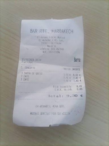 Está muy bonito, limpio, con una mesa muy bien montada, y con una amable atención por parte de Moha, el dueño, y de Batul, la camarera. Hemos pedido unos menús degustación, y a pesar de no conocer la gastronomía marroquí y tener alguna reserva por lo especiada que es, nos ha gustado, a mí especialmente el Tajín. El broche del menú han sido los dulces acompañados de té. Recomiendo ir a probarlo, porque saldrán encantados del conjunto que compone la comida, la atención y el local. Tenemos que abrir nuestra mente a conocer otras culturas gastronómicas y aquí en el restaurante Marrakech en Berriozar, junto a Decatlón, tenemos la oportunidad de hacerlo. Hemos disfrutado de una agradable velada y agradecemos a Moha y su equipo el trato...