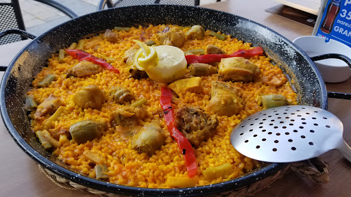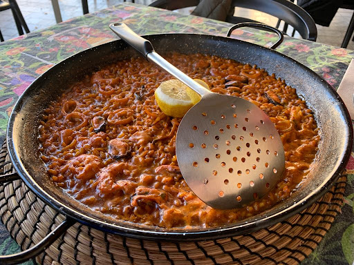 Read moreAgradable restaurante situado en una tranquila plaza en la que se encuentra el monasterio de Sant Pere de Besalú. Interior confortable , con cocina a la vista y una terraza en la que disfrutar de las vistas. En la carta hay platos de cocina casera mediterránea, amplio surtido de tapas y una variedad de paellas y arroces, tanto de pescados como de carne o verduras. Pedimos una ensalada verde muy completa y un arroz del senyoret para dos personas (paella marinera con gambas, mejillones y calamar, todo pelado y sin conchas). Muy rico y ración abundante, que nos dio para repetir, además de llevar bastante marisco. El color es rojizo. No sé cómo harán el sofrito, pero lo que es seguro es que lleva ñoras (se ven trocitos en el arroz) y bastante tomate y de ahí el color que tiene. Muy sabroso y punto de sal perfecto, preparado de una manera que no es la habitual que encontramos en Cataluña, por ese sofrito diferente. El servicio muy amable y la comida salió sin grandes esperas, lo justo que tarda en hacerse la paella, que cocinan al momento. El precio muy correcto. Por veinte euros euros por persona salimos saciados. Un grato...