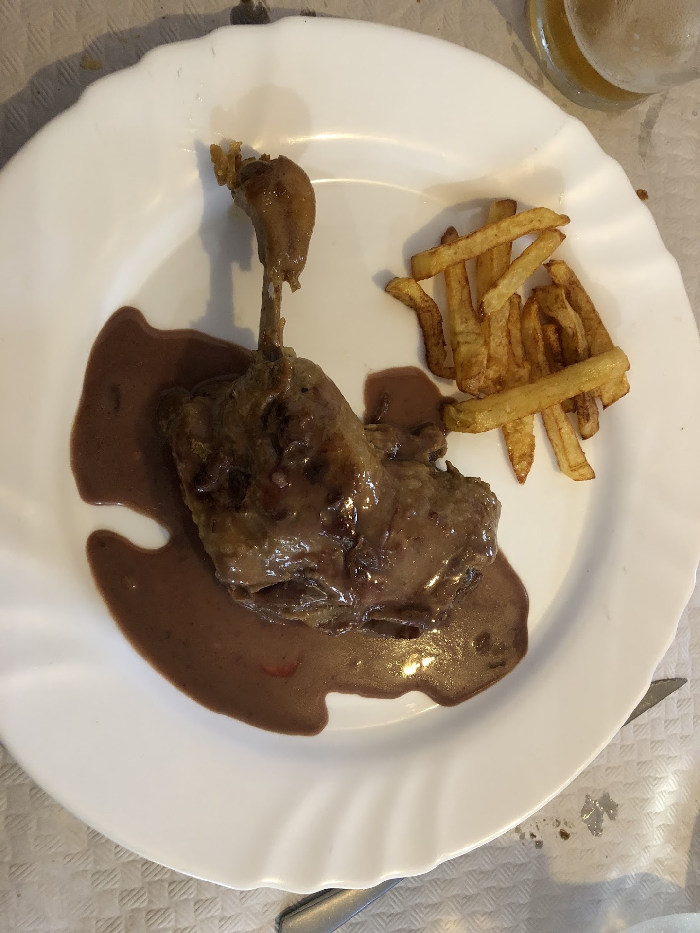 Al ser carnaval no tenían carta, solo la opción del menú que estaba en la pizarra. Aún y así, el camarero nos ofreció chuletón de 1 kg, en el caso de que nos quisiéramos menú y eso es lo que pedimos, junto a una buena ensalda. La carne estaba buenísima y las patatas fritas se notaba que eran caseras. Tanto la sopa castellana, como el pato, que eran los platos del menú, a pesar de no probarlo, tenían muy buena pinta y los demás clientes decían que estaba todo muy bueno.