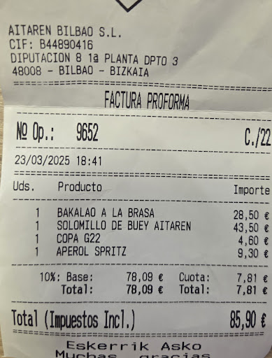 I could go on about the so-called "high quality" of Aitaren, but I think this is more than enough to paint the picture. And to top it all off, the prices are higher than some of the best fine-dining restaurants in Bilbao. I don’t mind paying more when the quality and service justify it—but in Aitaren, this match is nowhere to be found.