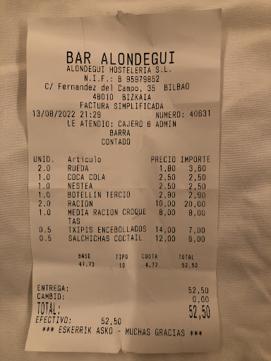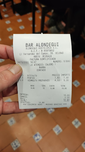 No acostumbro a suspender a ningún local, pero lo de este bar ha sido una auténtica estafa. De bebida nos pedimos dos vinos, dos refrescos y un tercio. Los vinos eran de un sorbo, los refrescos sin hielo y los vasos por la mitad, la única bebida decente era el tercio porque es igual en todos los sitios. La chica ni siquiera nos recomendó que había pinchos y como novatos en Bilbao pedimos de la escueta carta que tienen; 1/2 de croquetas, 1 de chipirones encebollados, 1 de cocktel de salchichas y 2 hamburguesas. Más de media hora esperando las raciones y 45 minutos las hamburguesas. La comida no llegaba y la chica nos pedía disculpas alegando que había mucha gente, pero todo el público solamente estaba bebiendo (por algo sería). Cuando llegan las raciones eran un auténtico chiste, pobres y sin ningún tipo de elaboración. Lo peor fueron las hamburguesas, cuando las trajeron llegaron sin patatas, y la chica decía que se habían quedado sin patatas, eso si nos cobraron 10€ por cada una mal hechas y chorreando sangre. Total una auténtica decepción y un trato denigra nte de la camarera que cuando le comentamos nuestro descontento nos respondió con un - Y que quiere que yo le haga! el gerente ni apareció eso que pedimos hablar con él, pero de lejos nos miraba de reojo, me imagino que avergonzado de la chapuza que estaba ofreciendo. Adjunto el ticket del...
