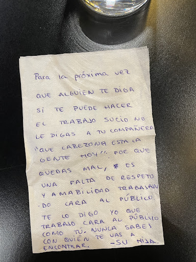 Read moreDía 29 de agosto de 2023 a las 10:00am. Todas las mesas ocupadas por restos de vajilla sucia y utilizadas de otros clientes. La camarera joven de la coleta larga con el pelo hasta la cintura (morena de pelo y ojos oscuros, piel blanca) del bar bilbbo de la estación subterranea de buses de Bilbao le a faltado al respeto a mi padre por quererle hacer el trabajo sucio dándole una respuesta de mala educación. Contexto: A pedido un trapo para limpiar la mesa en la que nos íbamos a sentar a tomar algo y le a dicho a su compañera “Que cabezona está la gente hoy” refiriéndose a mi padre y le e dejado yo esta nota: (Espero que la...