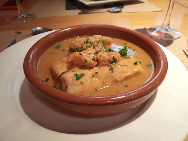 Como entrantes pedimos: Paleta Basatxerri, lomo curado y cecina ahumada acompañada de pan y tomate al virgen extra. ¡Exquisito! Ensalada de pulpo, lechugas variadas, zócalo de patata y langostinos con vinagreta de pimientos choriceros. ¡Como si estuviéramos en Galicia! -Pato confitado en rollito de brick con manzana y salsa de uvas pasas. Si dudas qué entrante escoger, ¡esta es tu mejor opción! Croquetas de bacalao al pil-pil y guindillas frescas fritas. El bacalao es la especilidad del jefe de cocina, ¡y vaya si se nota y saborea!