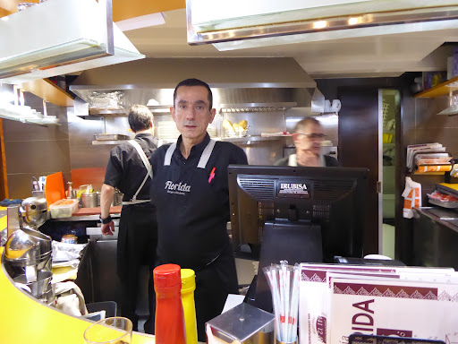 Read moreDespués de muchas hamburguesas en mi estómago fuimos a cenar a la hamburguesería Florida. Es muy característica por la cebolla rebozada que le ponen! Es un sitio concurrido pero en cuanto se libraron los sitios (es pequeño y se come en la barra, para mi particular y de vez en cuando way) un camarero limpio la mesa, nos puso cubiertos y nos atendió. Genial. Comimos hamburguesas completas y aunque la cebolla la esperaba más crujiente...es una buena hamburguesa! De las de cuchillo y tenedor. Luego pedimos una tortita para compartir con sirope de chocolate y nata...ni un pero, muy buena!! Tierna, esponjosa y de buen tamaño. Un detalle que me gustó mucho fue cuando entro una cuadrilla alborotando y uno de los camareros le hizo gestos de que bajase la voz....CHAPÓ, respeto al resto de comensales. En general un servicio de los que te hacen...